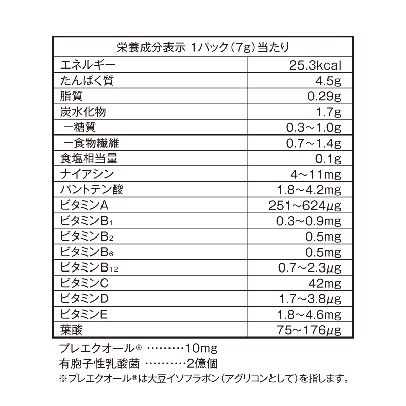 名 称 大豆たん白加工食品 原材料名 粉末状大豆たん白(国内製造)、大麦若葉末、ポリデキストロース(水溶性食物繊維)、澱粉、大豆抽出物、有胞子性乳酸菌末、りんご果汁末、抹茶、野菜・果物混合末/増粘剤(プルラン)、ビタミンC、甘味料(ステビア)、ビタミンE、ナイアシン、パントテン酸カルシウム、ビタミンB1、ビタミンA、ビタミンB6、ビタミンB2、葉酸、ビタミンD、ビタミンB12内容量 210g(7g×30パック) 賞味期限 枠外右部上段に記載 保存方法 高温、多湿及び直射日光を避けて保存してください。