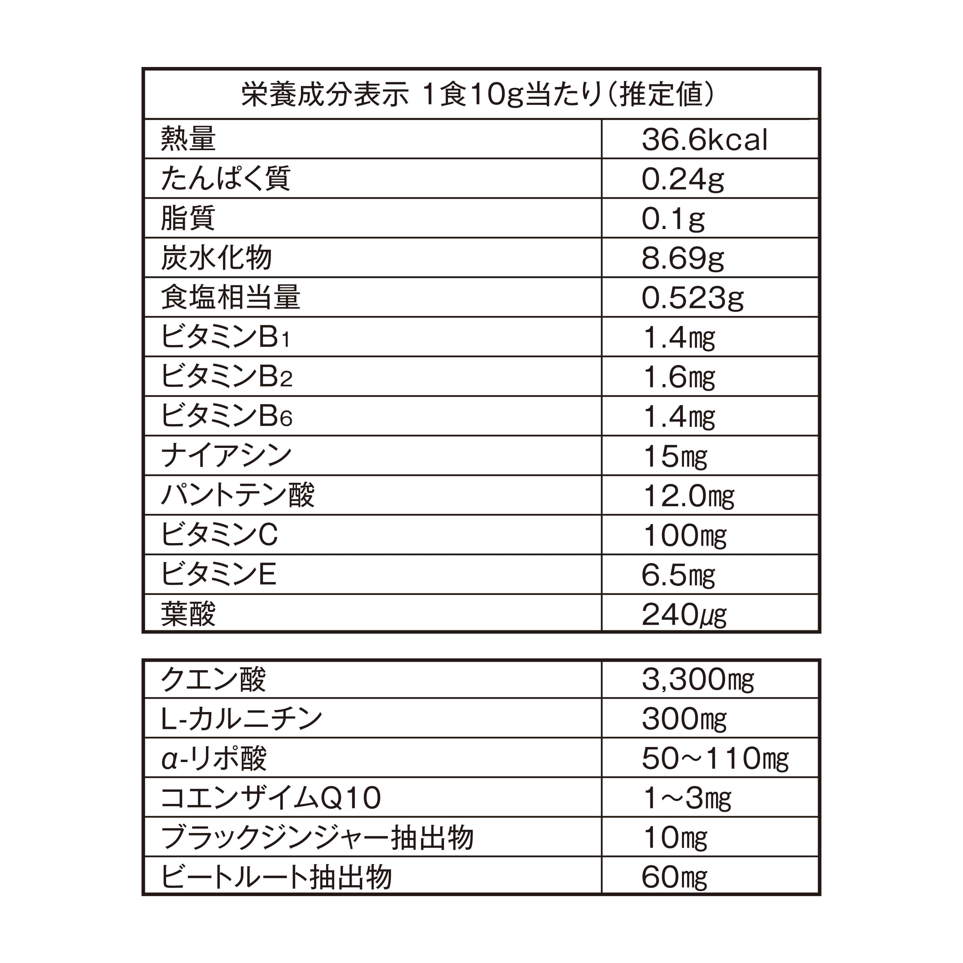 原材料マルトデキストリン(国内製造)、還元麦芽糖水あめ、L-カルニチンフマル酸塩、さとうきび抽出物、α-リポ酸、ビートルート抽出物、ビタミンE含有植物油、ブラックジンジャー抽出物、コエンザイムQ10/酸味料、ケイ酸カルシウム、ビタミンC、甘味料(スクラロース、アセスルファムK)、香料、ナイアシン、パントテン酸カルシウム、ビタミンB6、ビタミンB2、ビタミンB1、葉酸