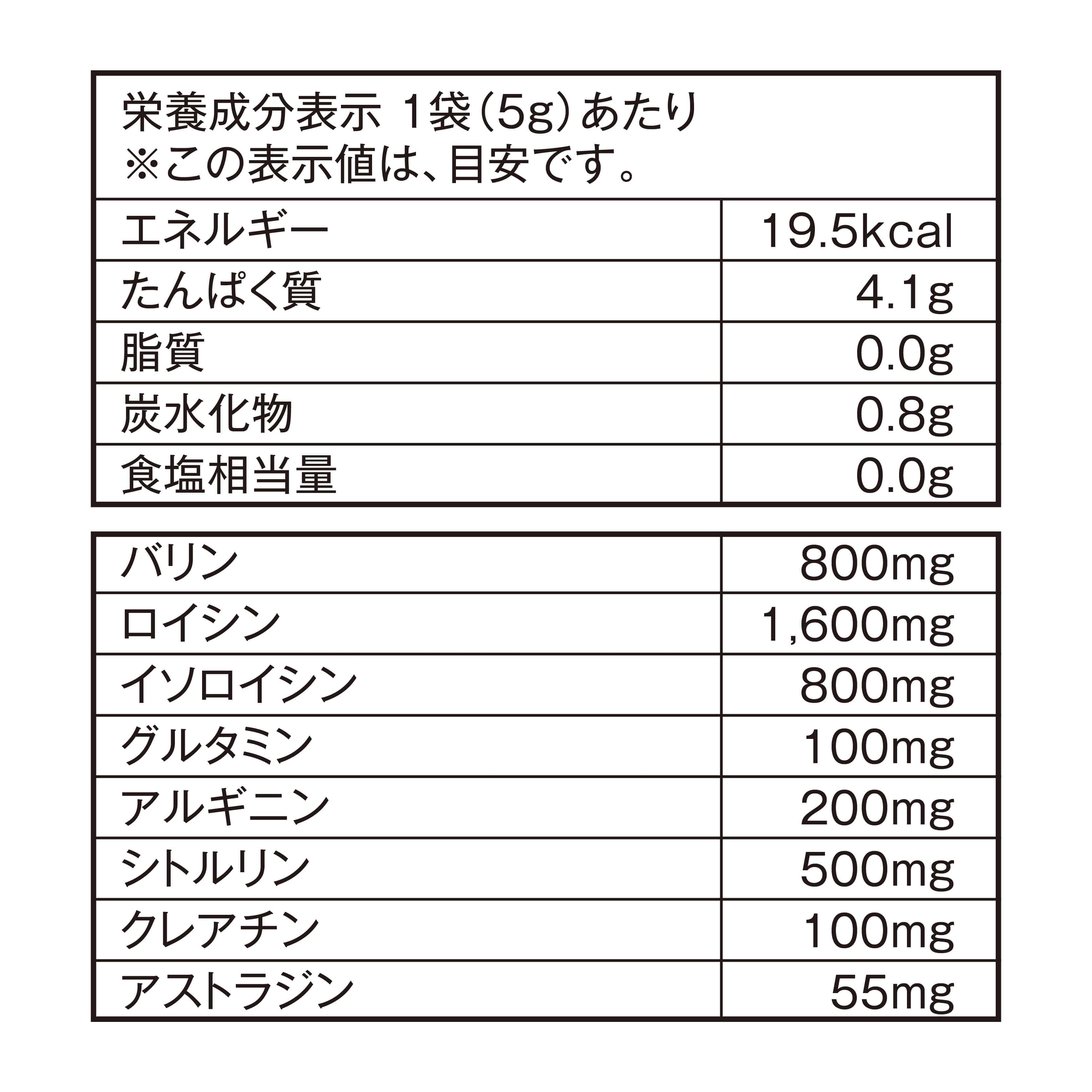 原材料L-シトルリン(中国製造)、クレアチン、植物混合抽出物(キバナオウギエキス末、デンシチニンジンエキス末、マルトデキストリン)/L-ロイシン、L-バリン、L-イソロイシン、クエン酸、香料、L-アルギニン、トレハロース、L-グルタミン、甘味料(アスパルテーム・L-フェニルアラニン化合物、スクラロース)、ビタミンC、クチナシ色素、紅麹色素、ビタミンE、ナイアシン、パントテン酸Ca、ビタミンB1、ビタミンA、ビタミンB6、ビタミンB2、葉酸、ビタミンD、ビタミンB12