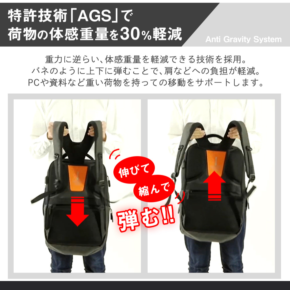 30%体感重量が軽減される『AGS機能』(Anti Gravity System)を搭載した多機能リュック。【無重力リュック】