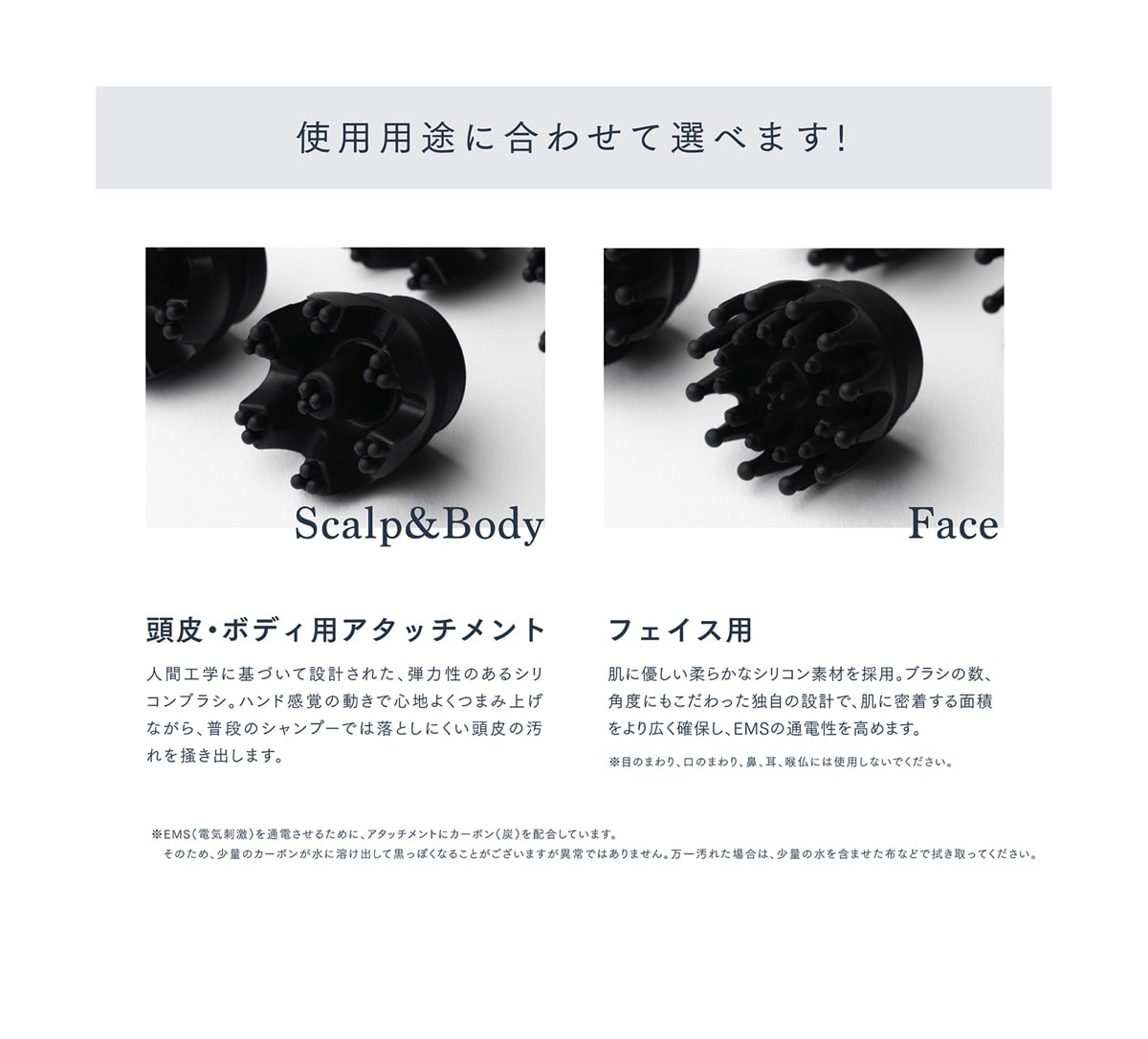 2種類のシリコンアタッチメントを付け替えることで、頭の先から足元まで、全身のリフトケア※にご使用できます。