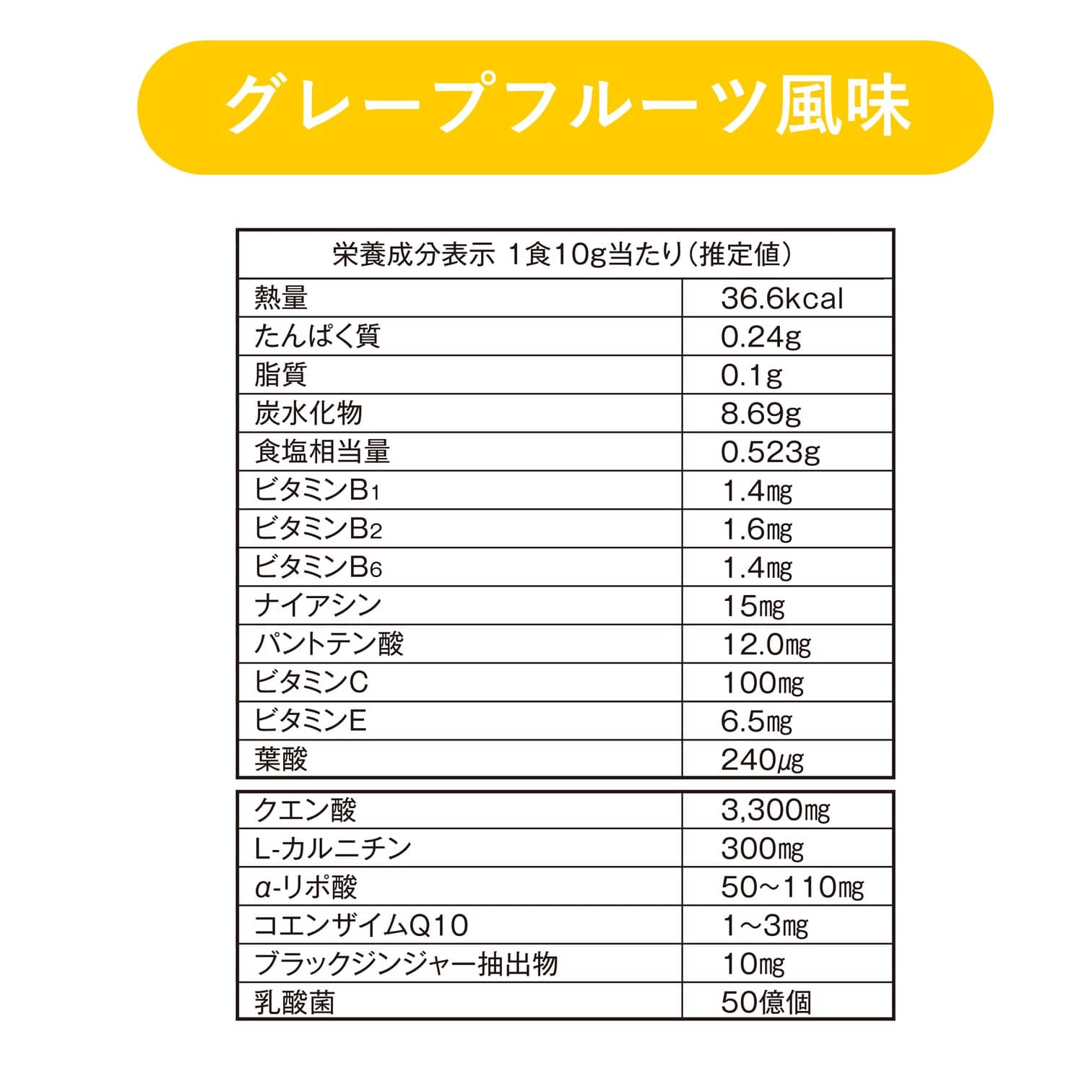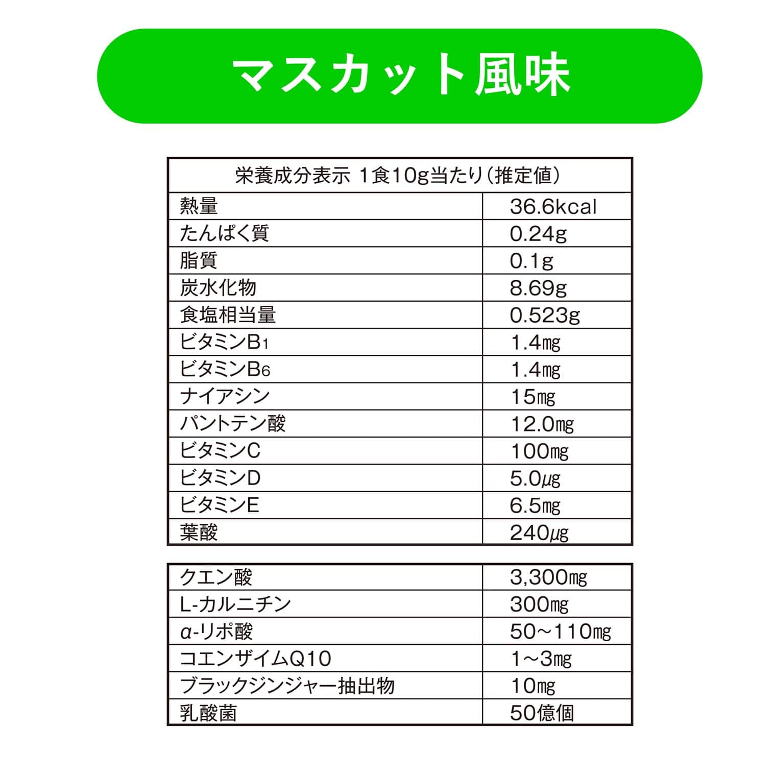 乳酸菌50億個原材料 マルトデキストリン(国内製造)、還元麦芽糖水あめ、L-カルニチンフマル酸塩、さとうきび抽出物、α-リポ酸、ビートルート抽出物、ビタミンE含有植物油、ブラックジンジャー抽出物、コエンザイムQ10/酸味料、ケイ酸カルシウム、ビタミンC、甘味料(スクラロース、アセスルファムK)、香料、ナイアシン、パントテン酸カルシウム、ビタミンB6、ビタミンB2、ビタミンB1、葉酸