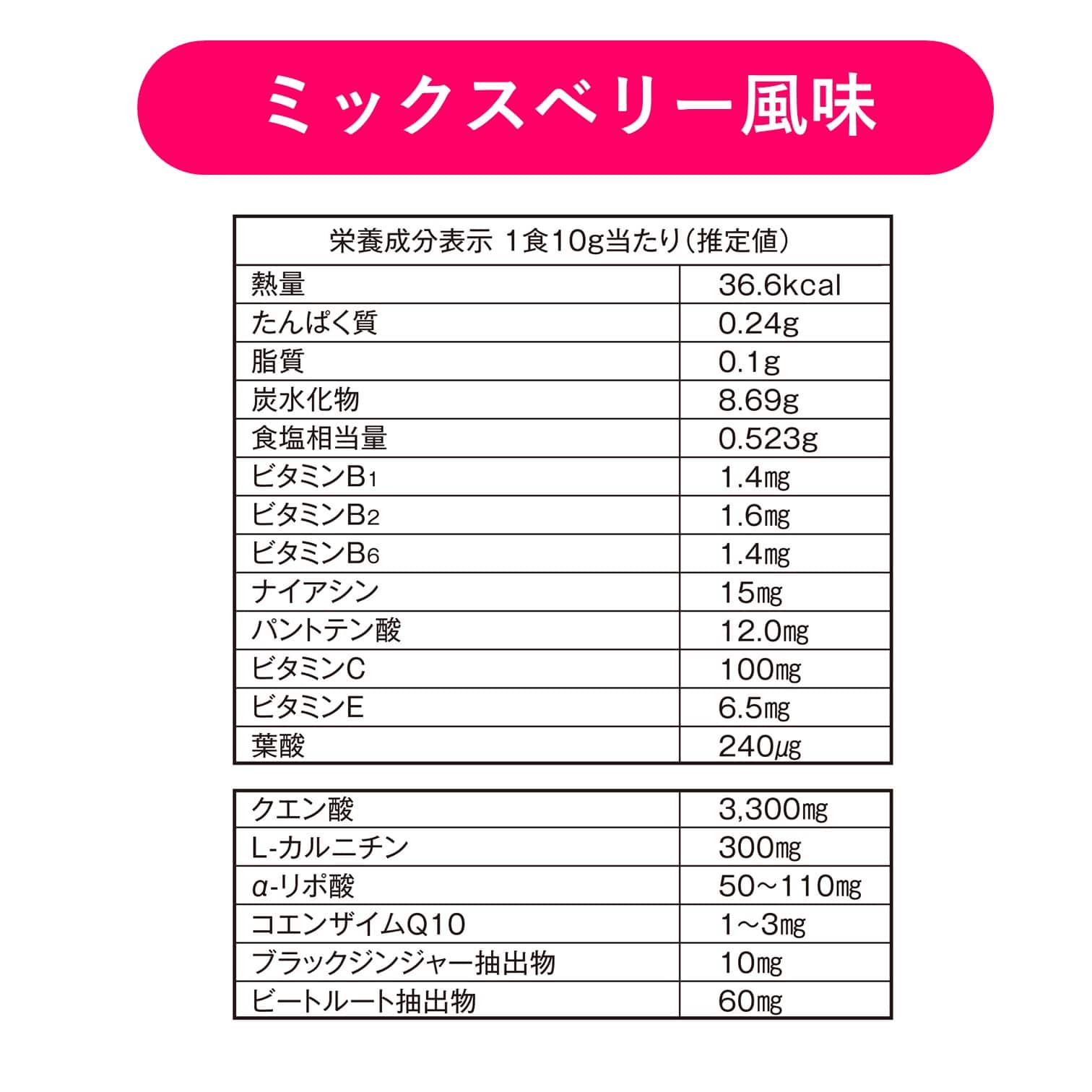ビートルート抽出物 60原材料 マルトデキストリン(国内製造)、還元麦芽糖水あめ、L-カルニチンフマル酸塩、さとうきび抽出物、α-リポ酸、ビートルート抽出物、ビタミンE含有植物油、ブラックジンジャー抽出物、コエンザイムQ10/酸味料、ケイ酸カルシウム、ビタミンC、甘味料(スクラロース、アセスルファムK)、香料、ナイアシン、パントテン酸カルシウム、ビタミンB6、ビタミンB2、ビタミンB1、葉酸